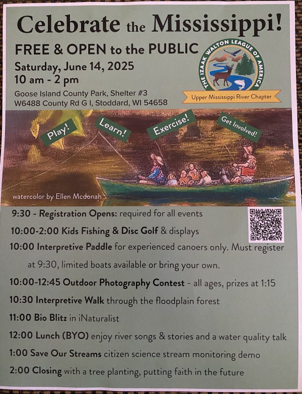 Volunteers will dress for being outdoors in the weather for a free, exciting June 14 "Celebrate the Mississippi" event that brings families and individuals outdoors to learn to fish, play disc golf, walk with an interpreter through a forest, complete a BioBlitz in I-Naturalist, help with a photography contest or other similar activity.  Volunteers will be matched to their interests wherever possible.  Volunteers should arrive by 9:45 am at Goose Island County Park Shelter #3 (W6488 County Rd G I, Stoddard, WI) and stay until at 2 pm if possible.  Shortened shifts are 9:45 am to 12:15 pm or 12 pm to 2:15 pm.  Please make clear arrangements.  Bring your best attitude to make this a wonderful experience for yourself and for the families and individuals looking to enjoy the Saturday of Fathers Day weekend. Bring a hat, sunglasses, sunscreen or whatever the weather demands that day. Our conservation group hopes to help people find ways to enjoy and appreciate the outdoors, with an emphasis on the Mississippi River.  Please contact Betty with any questions wisconsinbettydeboer@gmail.com and THANK YOU for your time!